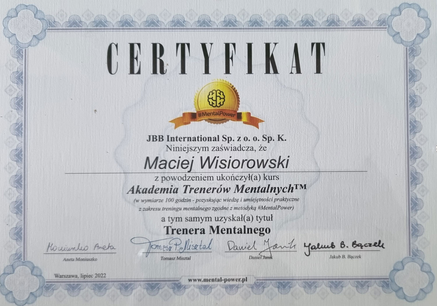 W ramach Akademii Trenerów Mentalnych poznałem modele i techniki, które w swojej pracy stosował Jakub. B. Bączek. Efektem wielu godzin intensywnej nauki jest dyplom oraz tytuł Trenera Mentalnego ale przede wszystkim wiedza, którą stosuję w pracy z moimi klientami.
